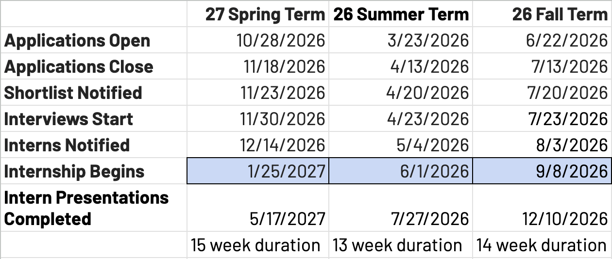 We offer two distinct internships running concurrently: Research and Social Media. Internships are unpaid and last for one term, from either January to May, June to August, or September to December. They are open to anyone eligible to work in the United States.